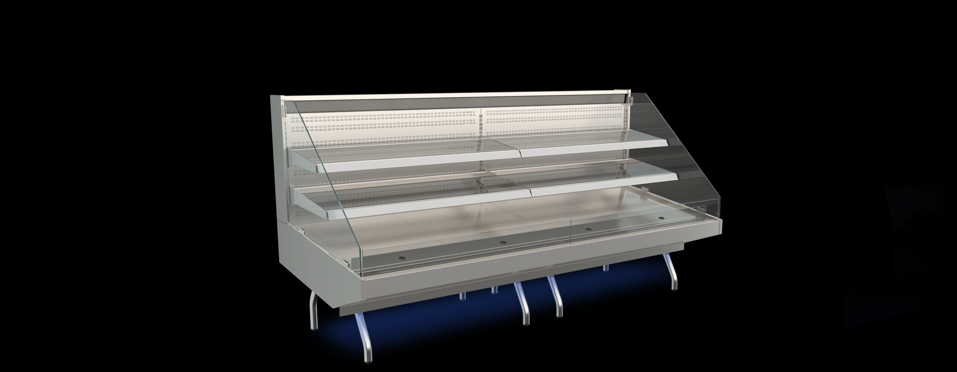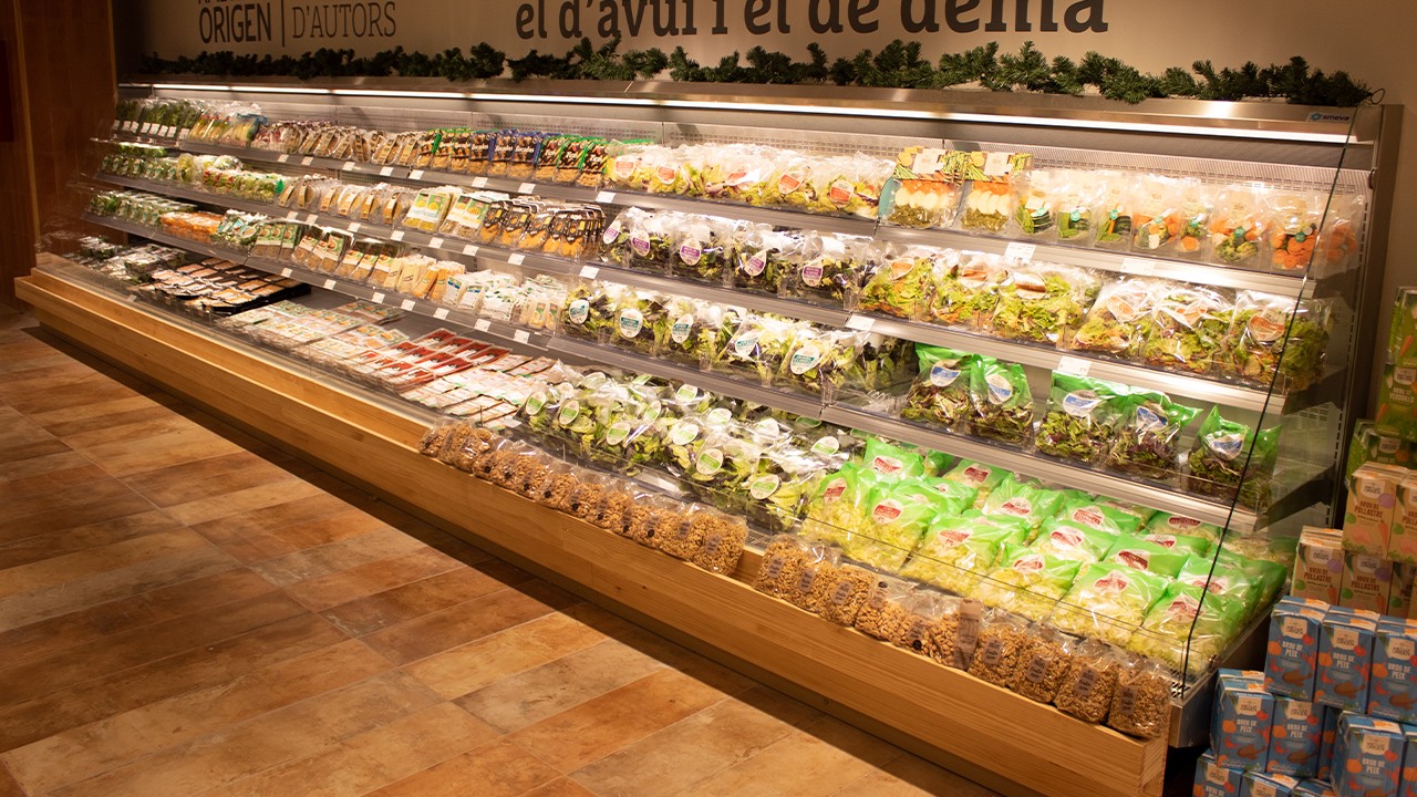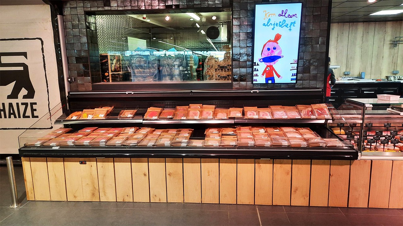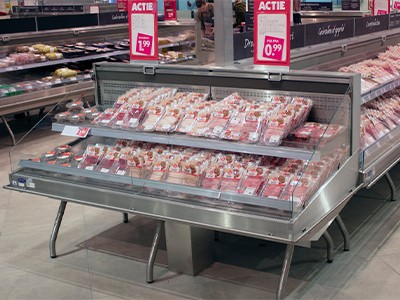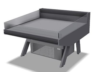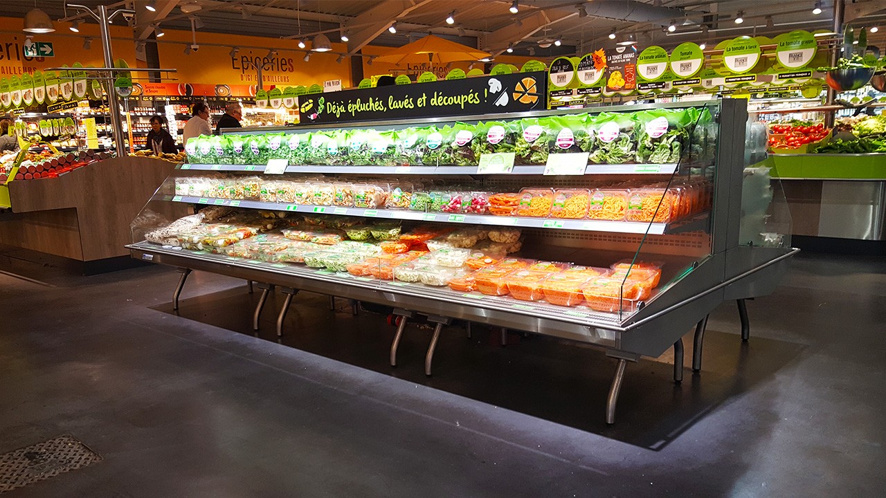 The interrupted bumpers and extra bases create the feeling of small, individual chiller display cabinets. Slender legs leave the floor free. This increases the appearance of a market square, making the chiller cabinet ideal to create a food market within your supermarket. The Market self-service display cabinet is ideal to cool all pre-packed produce, such as meat, fish, vegetables, tapas and ready meals.