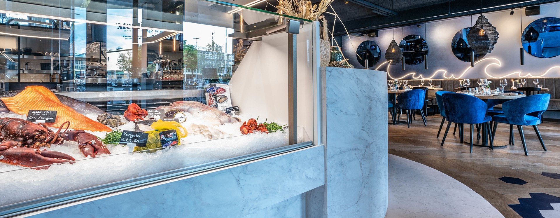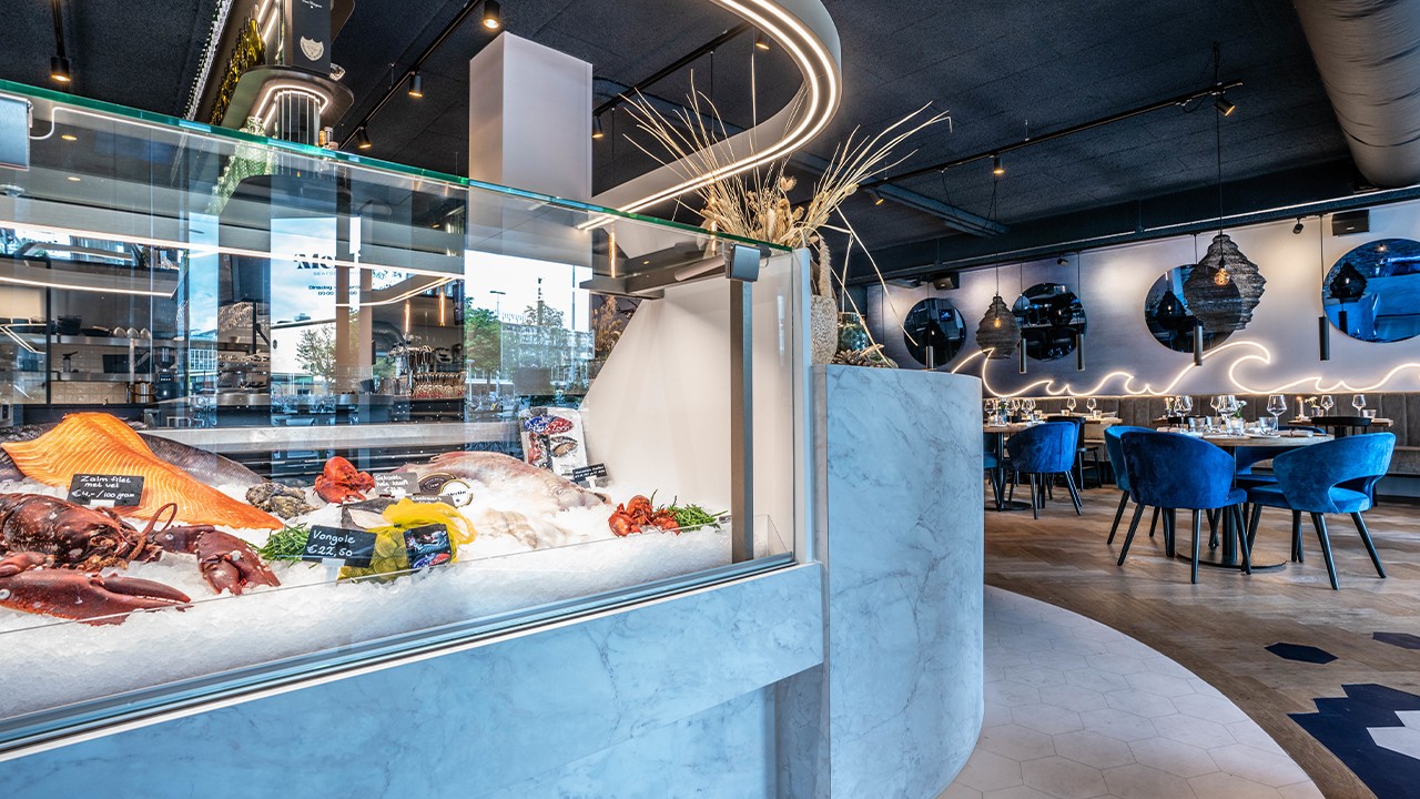 Every day top quality of fresh fish and a wide range of seafood. Smeva provided Merlin Seafood - Bar & Shop with a new fishcounter and cooling installation. The Vision MKll with flaked ice was chosen to present the luxurious range of fish products in a beautiful way. The cooling installation ensures lower energy consumption, with an electronic control for optimal cooling.